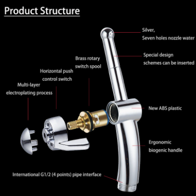 Penyembur bidet kami mempunyai muncung perak 7 lubang yang memberikan aliran air yang lembut, sekata dan kuat. Ia menyediakan pembersihan yang lembut dan menyeluruh untuk kebersihan diri, sambil mengekalkan tekanan yang kuat untuk pembersihan tandas dan permukaan yang berkesan, sesuai untuk semua keperluan bilik mandi anda.